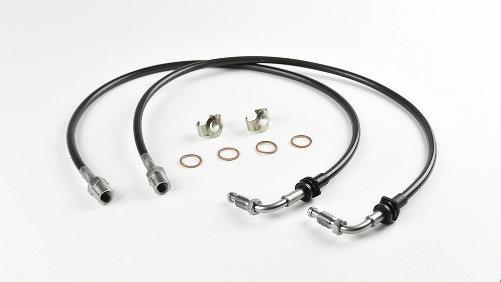 The caliper carriers are made from lightweight aluminium. These have steel thread inserts for strength along with a black anodised finish. The supplied front brake lines have been made to our specifications by HEL Performance, which include stainless steel fittings and are finished in their carbon black sheathing. The fitting kit includes bolts that are high tensile M12x1.25 coupled with quality spring washers.